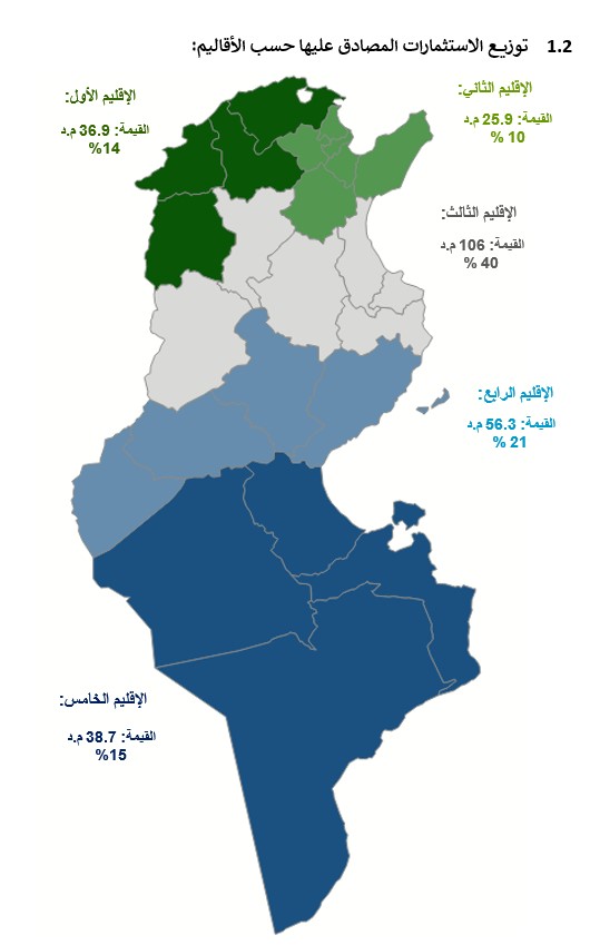 صادقت اللجنة الوطنية واللجان الجهوية لإسناد الامتيازات إلى موفى شهر أوت 2025 على 1691 عملية استثمار بقيمة 263.8 م.د بمعدل 156 أ.د للعملية الواحدة، فيما بلغت قيمة المنح المصادق عليها حوالي 62.7 م.د بمعدل 37 أ.د للمشروع الواحد. وستمكن الاستثمارات المصادق عليها من برمجة احداث 1660 موطن شغل قار.